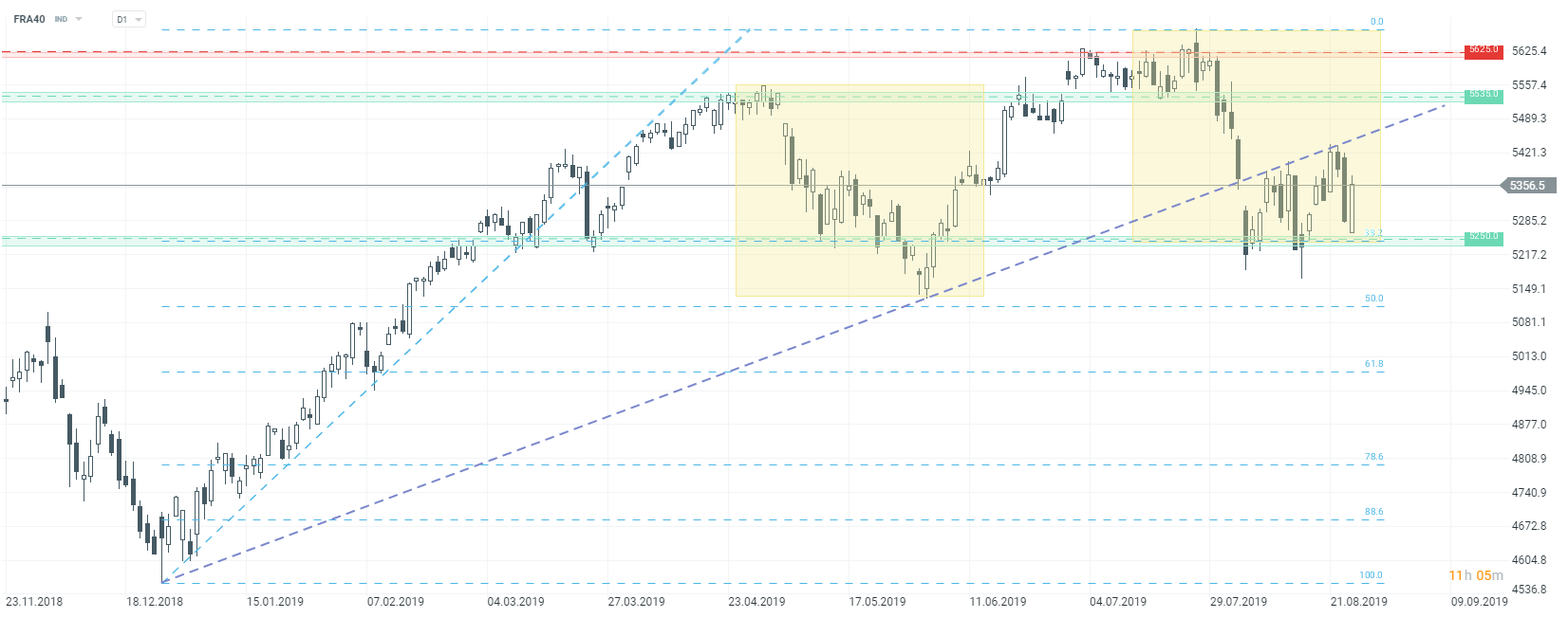 L'indice français a également connu des baisses significatives à la fin de la semaine dernière. Cependant, la première session après le week-end apporte une reprise. Ce qui peut être intéressant, c’est le fait que les prix ont rebondi proche de leur zone de support, avec les 38,2% de niveau Fibo et une géométrie de marché de 1: 1 de l'analyse overbalance. L'indice a du mal à se dégager au-dessus de la ligne de tendance depuis un certain temps. Cela dit, un autre test de la marge de 5 250 pts ne peut pas être exclu et si le prix dépasse la zone marquée en vert sur la carte, le déclin peut s'accélérer. Dans un tel scénario, le retracement Fibo à 50% pourrait être le prochain niveau de support à surveiller.