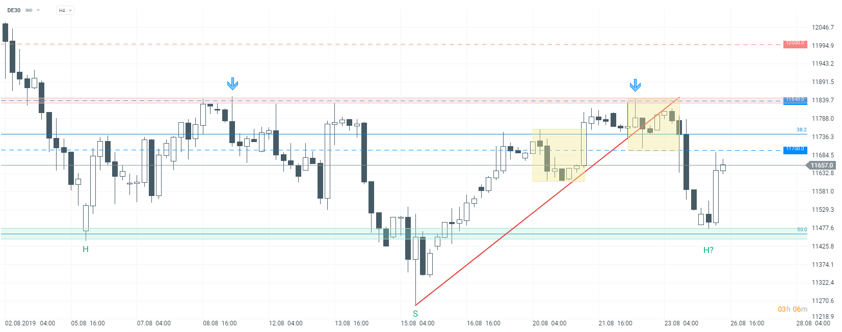 Les vendeurs dominent la bourse allemande depuis un certain temps déjà. L'indice allemand a plongé vendredi à 11.460 vers la zone de support, où se situe son support majeur du 6 août. Avec le rebond d’aujourd’hui, il semble que la figure chartiste épaule tête épaule inversée se renforce. Toutefois, il convient de garder à l’esprit que le signal «achat» sera généré au moment de la rupture au-dessus d de la zone de résistance située à 11,840 poignées. Tant que le prix est inférieur à cet obstacle, les positions acheteuses doivent être traitées avec prudence. La résistance à court terme la plus proche peut être trouvée à 11700 points.