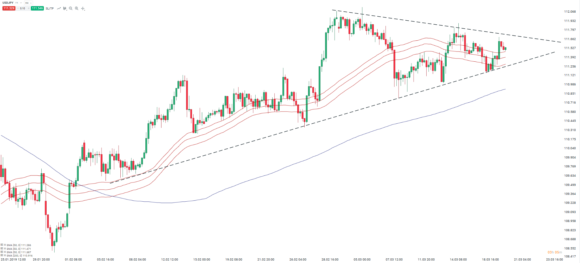 Sur une échelle de temps intra journalier, la paire évolue dans un triangle ascendant. Depuis le début du mois, l’USDJPY évolue de manière latérale. Le triangle étant une figure de consolidation, nous pouvons nous attendre à une poursuite de la tendance haussière. La décision monétaire du FOMC et la conférence de presse de Powell pourraient donner une orientation à la paire. En cas de dépréciation du dollar, la baisse pourrait être stoppée par la moyenne mobile à 200 périodes. Une sortie haussière du triangle serait un signal pour les « bullish » (acheteurs) et pourrait amener la paire au niveau des 78,6 % des retracements de Fibonacci.