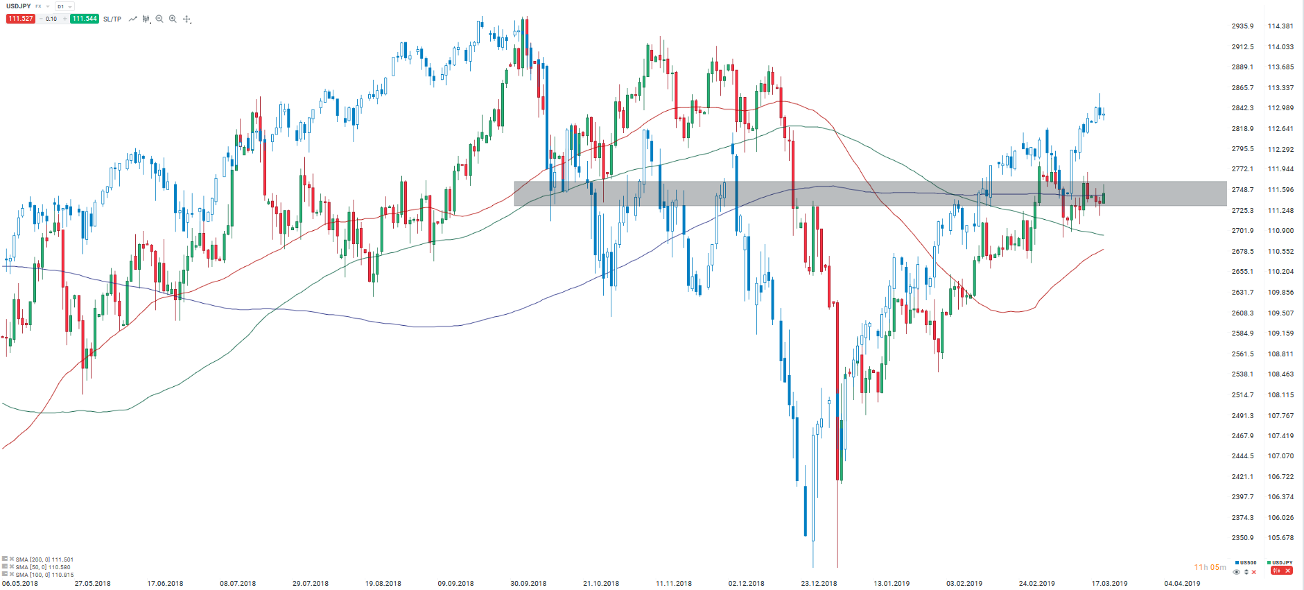 Sur un horizon temporel journalier (D1), on peut constater que le rebond en « V » du JPY ressemble fortement à celui de l’indice américain S&P500. La relation inverse entre niveau des indices boursiers et valeur du yen s’explique par le fait que la monnaie japonaise est considérée comme une valeur refuge. La paire fluctue à l’intérieur d’une zone de résistance (zone grise sur le graphique ci-dessous), où l'on peut également trouver une moyenne mobile à 200 périodes. Il convient de noter que la volatilité des dernières semaines sur le S&P500 laisse à penser que l'USDJPY pourrait encore augmenter.