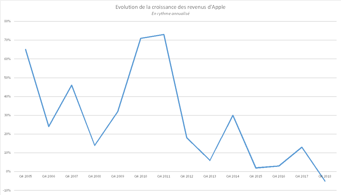 Evolution de la croissance des revenus d’Apple (en rythme annualisé)