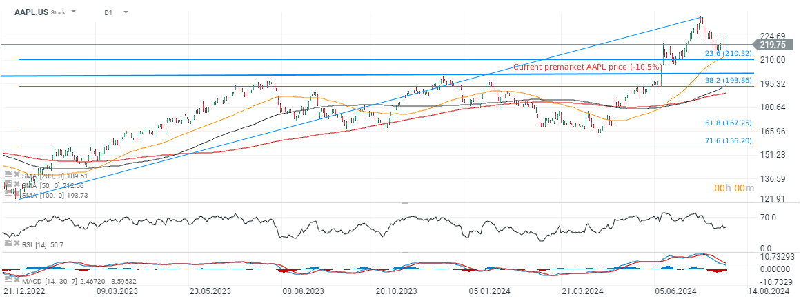 Les catalyseurs des nouveaux produits AI et des résultats solides n'ont pas suffi à maintenir la valorisation d'Apple, le marché anticipant une hausse des chances de ralentissement de l'économie américaine. Les investisseurs cherchent à modifier leurs positions pour les mois à venir, et bien que la récession ne soit pas encore une certitude, Wall Street commence déjà à se retirer des actions qui pourraient être les plus affectées par une économie plus faible. Le premier soutien important pour Apple se situe autour de la SMA200 (ligne rouge) et du retracement de Fibonacci à 38,2 %, près de 190 dollars par action.