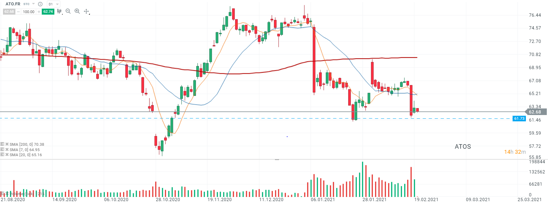 Les cours d’Atos (ATO.FR) ont ouvert avec un léger gap baissier se repliant vers la zone de support au niveau des 61,73 au moment de la rédaction de ces lignes. En cas de cassure de ce niveau, le mouvement baissier pourrait s’étendre vers le creux du 04/11 à 59,25. Source : xStation5