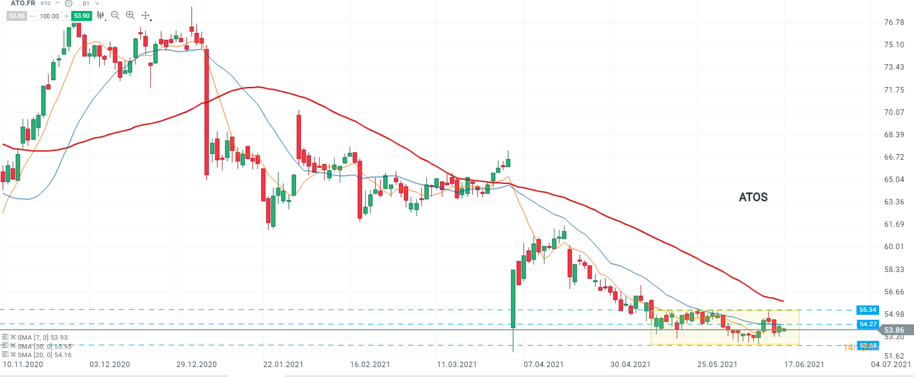 Les cours d’Atos (ATO.FR) évoluent au sein d’un range intégré le 13/05 avec pour borne supérieure 55,34 et pour borne inférieure 52,68. Au moment de la rédaction de ces lignes, les cours se dirigent vers la SMA 20 (ligne bleue) à 54,27. En cas de franchissement de ce niveau, le prochain niveau à surveiller est la borne supérieure du range. Toutefois, si les vendeurs prennent le contrôle la borne inférieure du range serait à envisager. Source : xStation5