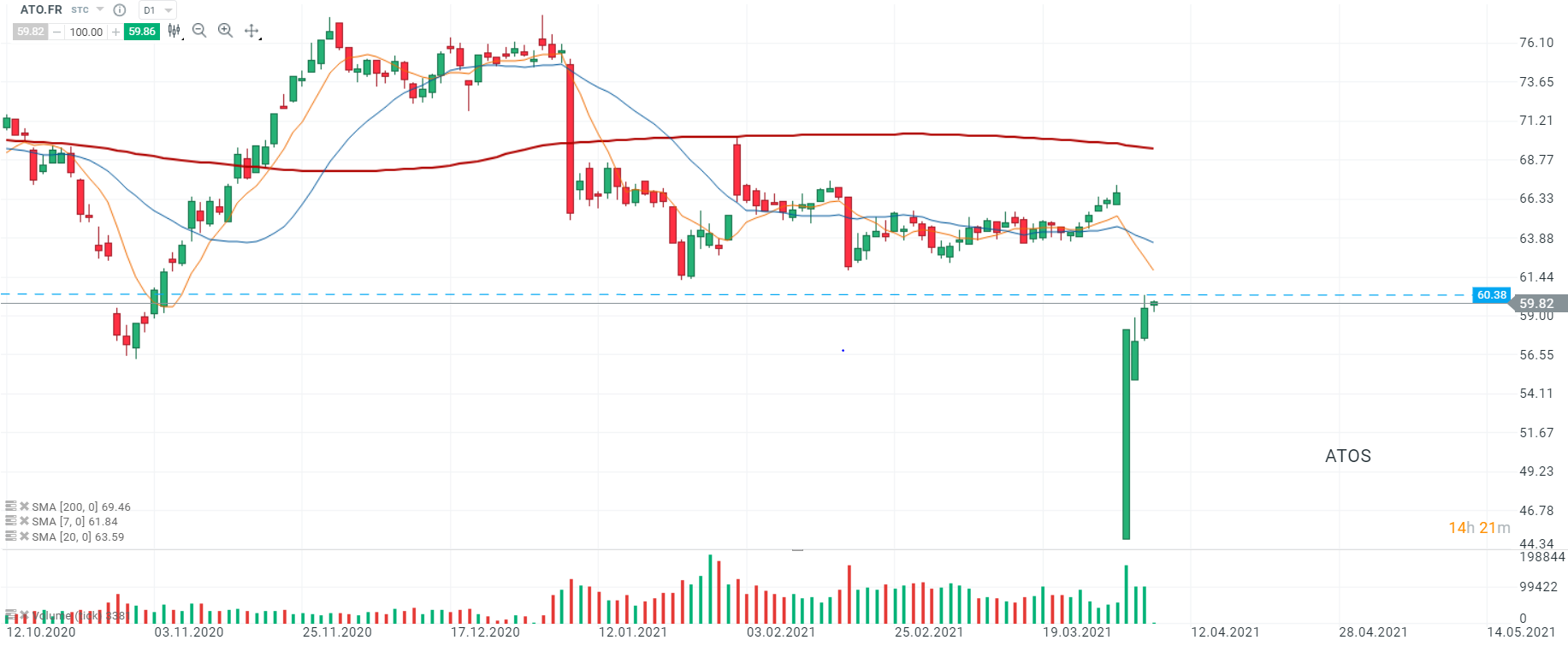 Après le gap breakaway baissier massif du 01/04, les cours d’Atos (ATO.FR) ont tenté en cette courte semaine marquant le retour du week-end de Pâques de combler ce gap. Aujourd’hui, le mouvement se poursuit et les cours tentent de se hisser au-dessus du sommet de la veille à 60,38. Si le sentiment actuel prévaut et que les cours parviennent à franchir le niveau mentionné ci-dessus, une impulsion haussière vers le niveau qui coïncide avec la zone de support précédente et la SMA 7 (ligne orange) à 61,98 pourrait être amorcée. Source : xStation5