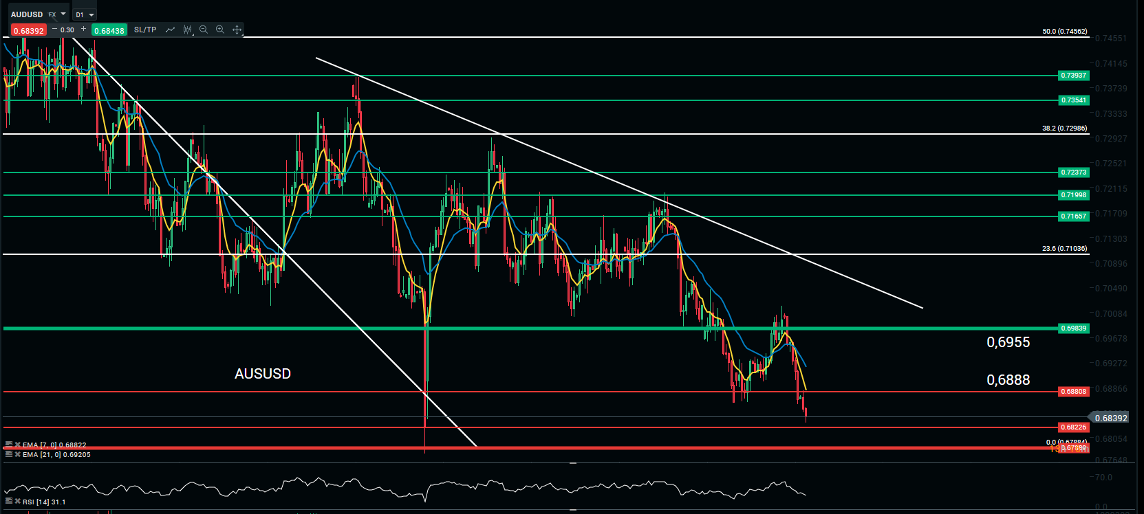 Sur le plan technique, la paire a franchi à la baisse plusieurs zones de support. Toutefois, la zone des 0,6822 porte toujours les cours. Le discours de la Fed aura une grande influence sur la paire.