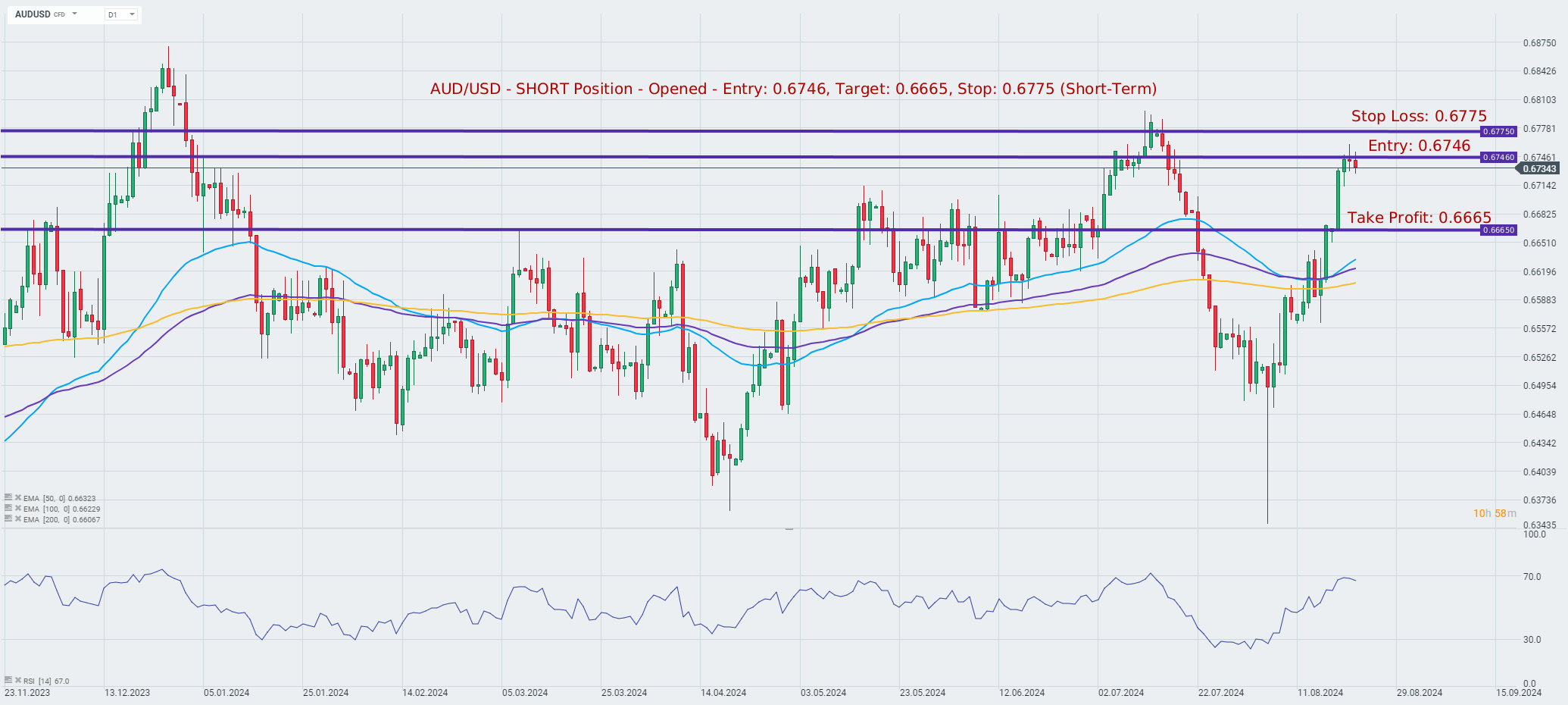 Refinitiv recommande de prendre une position courte sur la paire AUDUSD au prix du marché avec un objectif de 0,6665 et un ordre stop loss à 0,6775. Source : xStation5