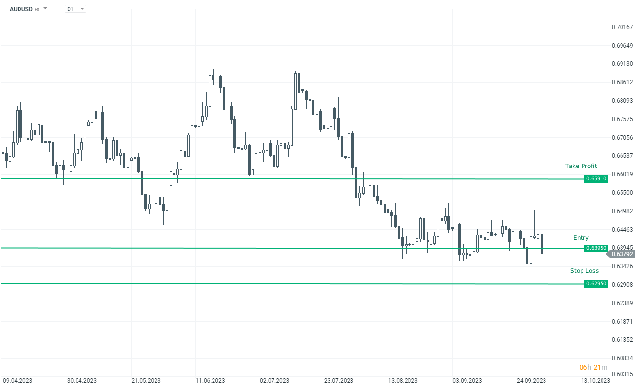 Le Crédit Agricole recommande de prendre une position longue sur AUDUSD au prix du marché avec un objectif de 0,6591 et un ordre stop loss placé à 0,6295. Source : xStation5