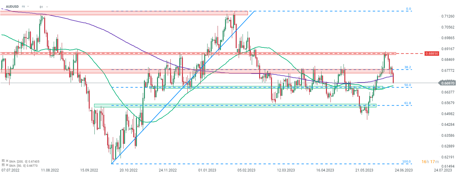 L'AUDUSD toujours en baisse et passe en dessous de la moyenne mobile sur 200 séances aujourd'hui. La paire se négocie au plus bas depuis début juin, suite à la baisse de l'indice PMI des services australien. Source : xStation5.