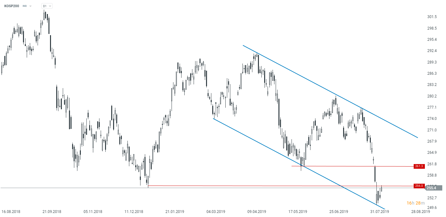 Le KOSPI coréen gagne 1% ce matin avec un rebond à partir de la limite inférieure du canal descendant. Source: xStation5