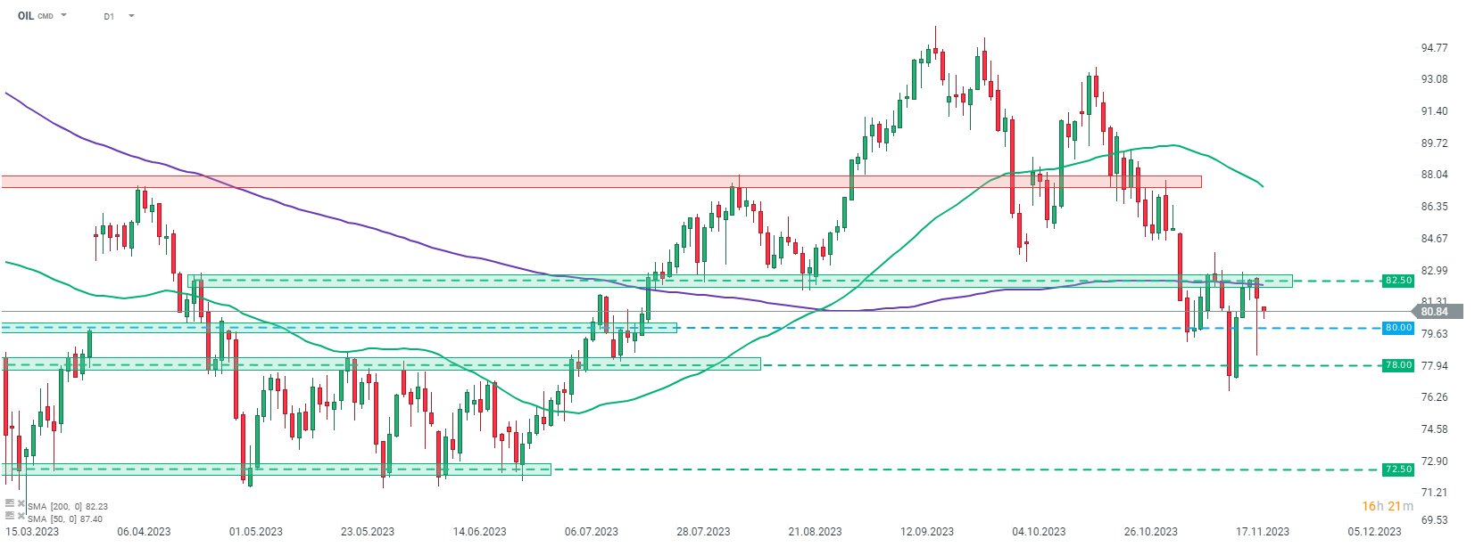 Le prix du pétrole continue de baisser après avoir échoué à franchir la zone de résistance des 82,50 dollars, marquée par la moyenne mobile sur 200 séances (ligne violette). Source : xStation5.