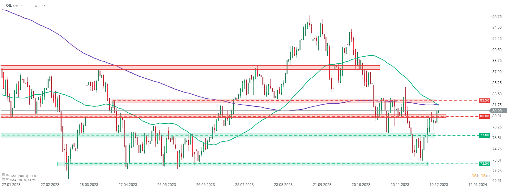 L'huile continue de gagner du terrain alors que les tensions augmentent au Moyen-Orient et que les attaques plus fréquentes des Houthis sur les navires dans la mer Rouge se multiplient. Le Brent (OIL) se négocie près de ses plus hauts mensuels et approche la zone des 81 $. Source : xStation5.