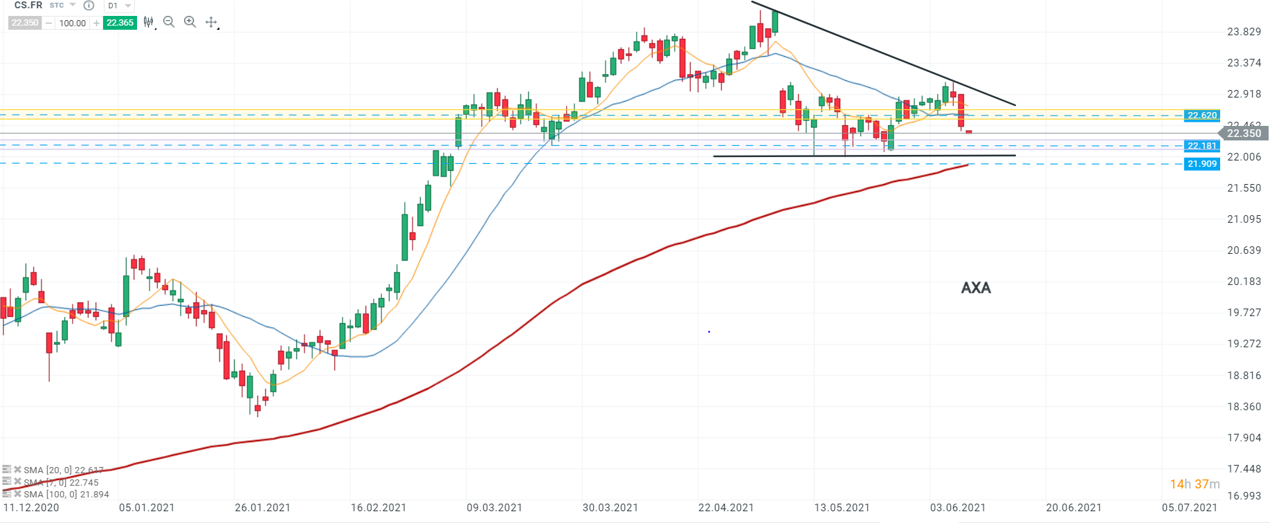 Les cours d’Axa (CS.FR) évoluent à la baisse aujourd’hui, se dirigeant vers la zone de support à 22,181 au moment de la rédaction de ces lignes. Si le sentiment actuel prévaut, le mouvement baissier pourrait s’étendre en direction de la zone qui coïncide avec la limite inférieure du triangle, la précédente zone de support et la SMA 100 (ligne rouge) au niveau des 21,909. Toutefois, si les acheteurs prennent le contrôle, la précédente zone de support à 22,620, renforcée par la SMA 20 (ligne bleue) et la limite supérieure du triangle, constitue la prochaine cible. Source : xStation5
