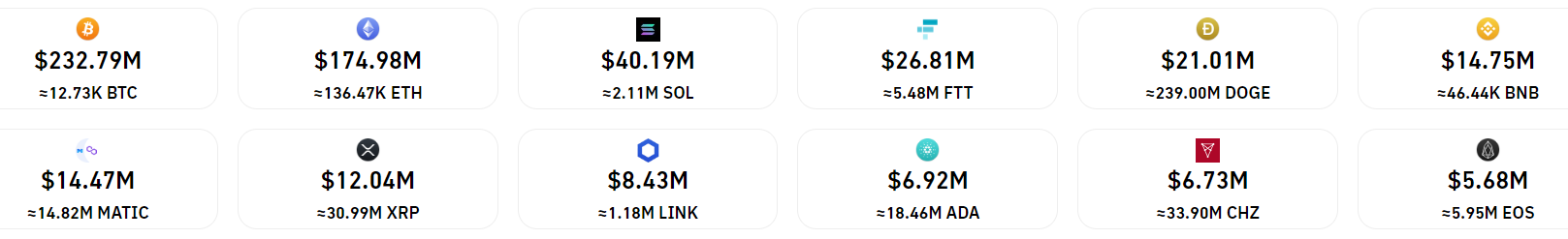 Au cours des dernières 24 heures, les liquidations ont été dominées par Bitcoin et Ethereum où les acheteurs ont subi près de 400 millions de dollars de pertes. Le prochain en ligne est Solana et le jeton d'échange FTX, qui a perdu près de 80 % après que Sam Bankman-Fried a annoncé la vente de l'exchange à son plus grand concurrent, Binance. La baisse des liquidations de jetons FTX indique que les baisses du token étaient probablement dues à l'offre de traders au comptant, Binance contribuant également probablement aux baisses, vendant des tokens à des prix de plus en plus bas face à une demande faible. Source : Coinglass