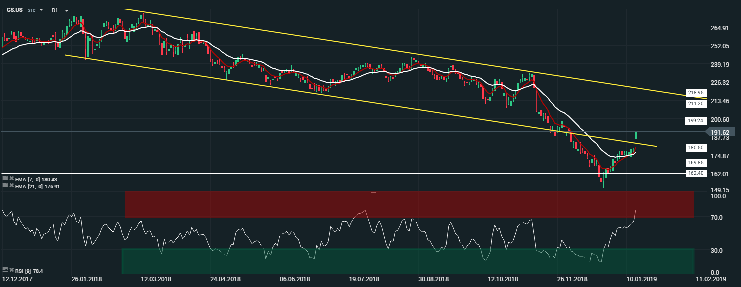 Les deux banques d’affaires américaines ont dégagé des bénéfices plus élevés que prévu pour le quatrième trimestre de l’année 2018. Goldman Sachs a annoncé un bénéfice par action de 6,05 $ contre 4,53 $, avec un bénéfice de 8,08 milliards de dollars bien au-dessus des prévisions des analystes de 7,54 milliards de dollars. Même son de cloche pour Bank of America qui affiche un bénéfice par action à 70 cents de dollars contre 63 cents selon les estimations des analystes. Ces publications soutiennent l’ensemble du secteur bancaire américain et européen, entrainant les indices à la hausse.