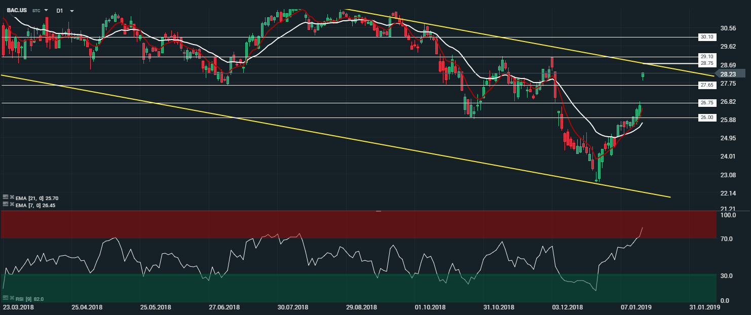 En unité de temps journalière (D1), le titre Bank of America (BAC.US) évolue en tendance baissière au sein de son canal baissier. Les cours sont portés par les moyennes mobiles à 7 et 21 périodes. Le RSI est orienté à la hausse et oscille à 71,6 points. Dans ce contexte, nous serons baissiers sur le titre avec comme objectif le niveau des 26,75 $ (correspondant au comblement du gap haussier formé ce jour).