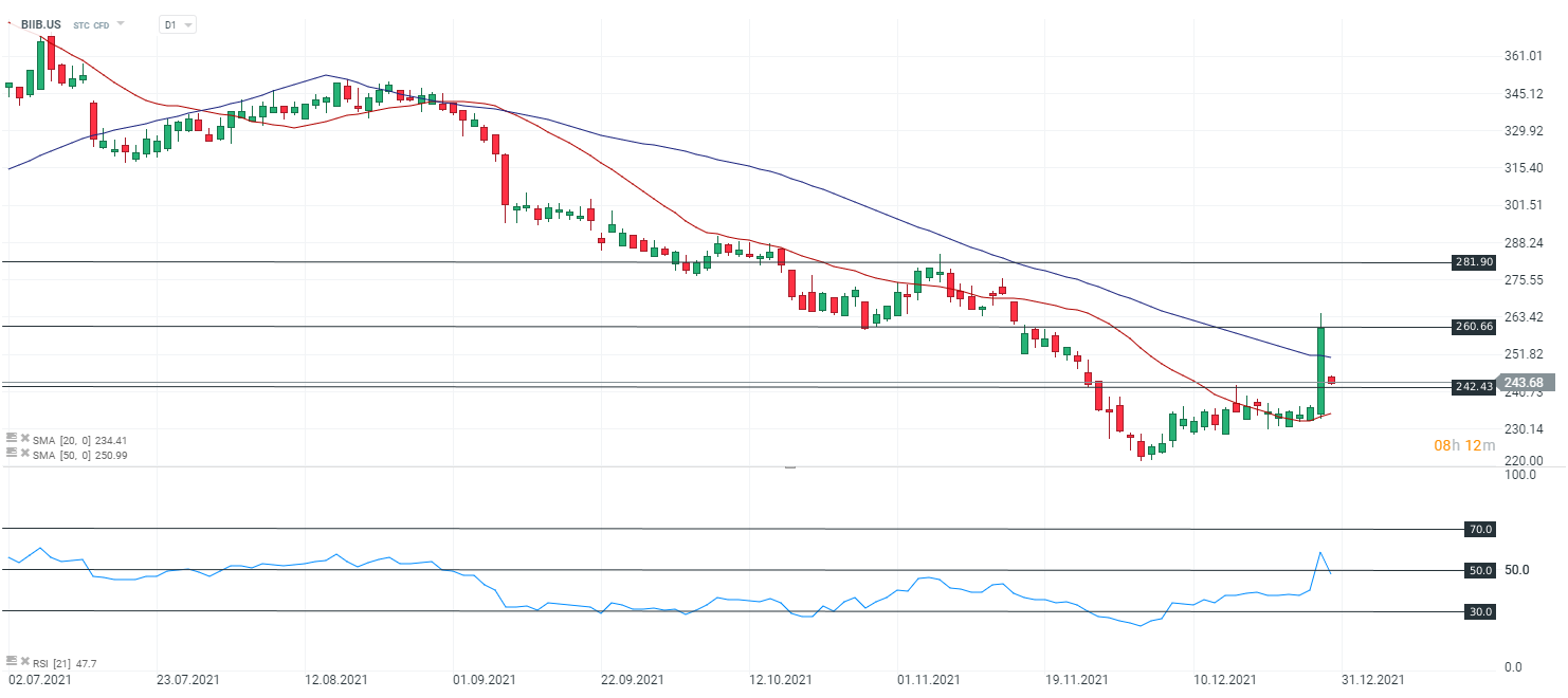D’un point de vue fondamental, il faut rester à l’affût quant au secteur technologique et à l’action Biogen. Nous sommes dans un contexte où les investisseurs n’ont pas d’autres alternatives que d’investir sur des actifs risqués, mais cela pourrait changer en 2022 avec le resserrement des politiques américaines et européennes. Cela pourrait engendrer des fluctuations négatives sur la globalité des marchés US, mais nous n’y sommes pas encore.