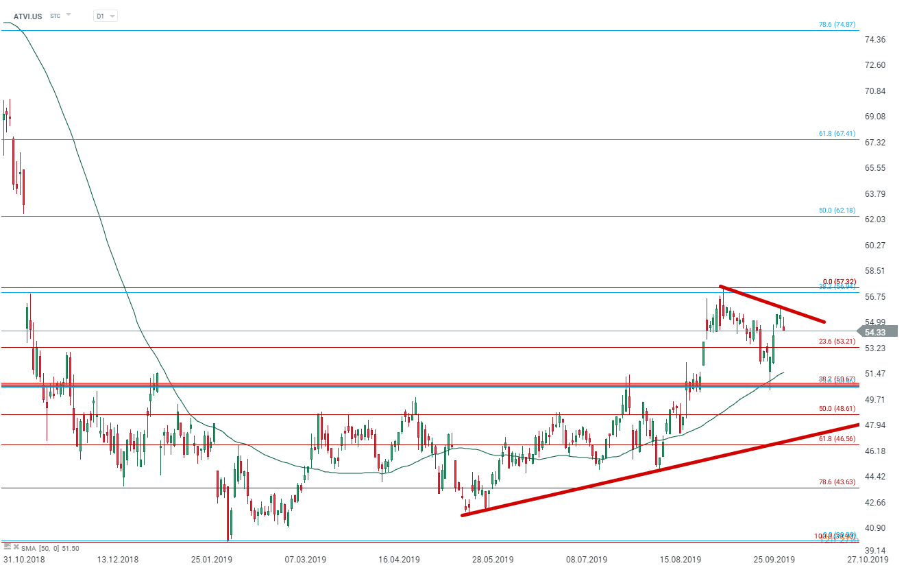 Le titre Blizzard (ATVI.US) évolue en tendance haussière. Cependant les cours n’ont pas réussi à s’affranchir des 38.2 % des retracements de Fibonacci (du mouvement baissier d’octobre 20018 à février 2019). Nous prendrons connaissance des résultats du 3 trimestres 2019 du groupe le 11 novembre. Cependant, au vu de l’actualité, les cours pourraient venir chercher la zone de support des 50.60 $ matérialisée par le cluster des retracements de Fibonacci. Source : xStation5.