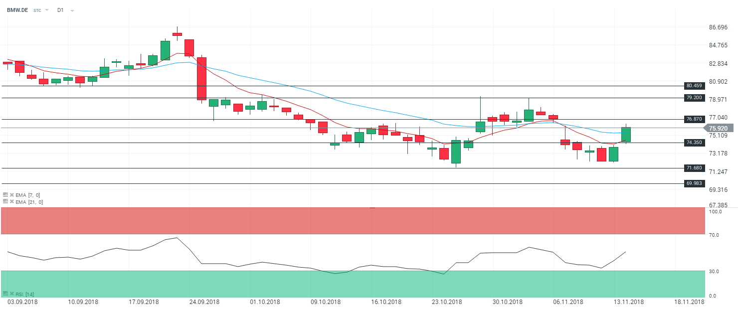 En unité journalière (D1), le titre BMW (BMW.DE) évolue en tendance haussière. Les cours sont soutenus par les moyennes mobiles à 7 et 21 périodes. Le RSI est orienté à la hausse et oscille à 50,7 points. Dans ce contexte, nous serons baissiers sur le titre BMW avec en ligne de mire le niveau des 74,35 € - et le niveau des 71,68 € par extension.