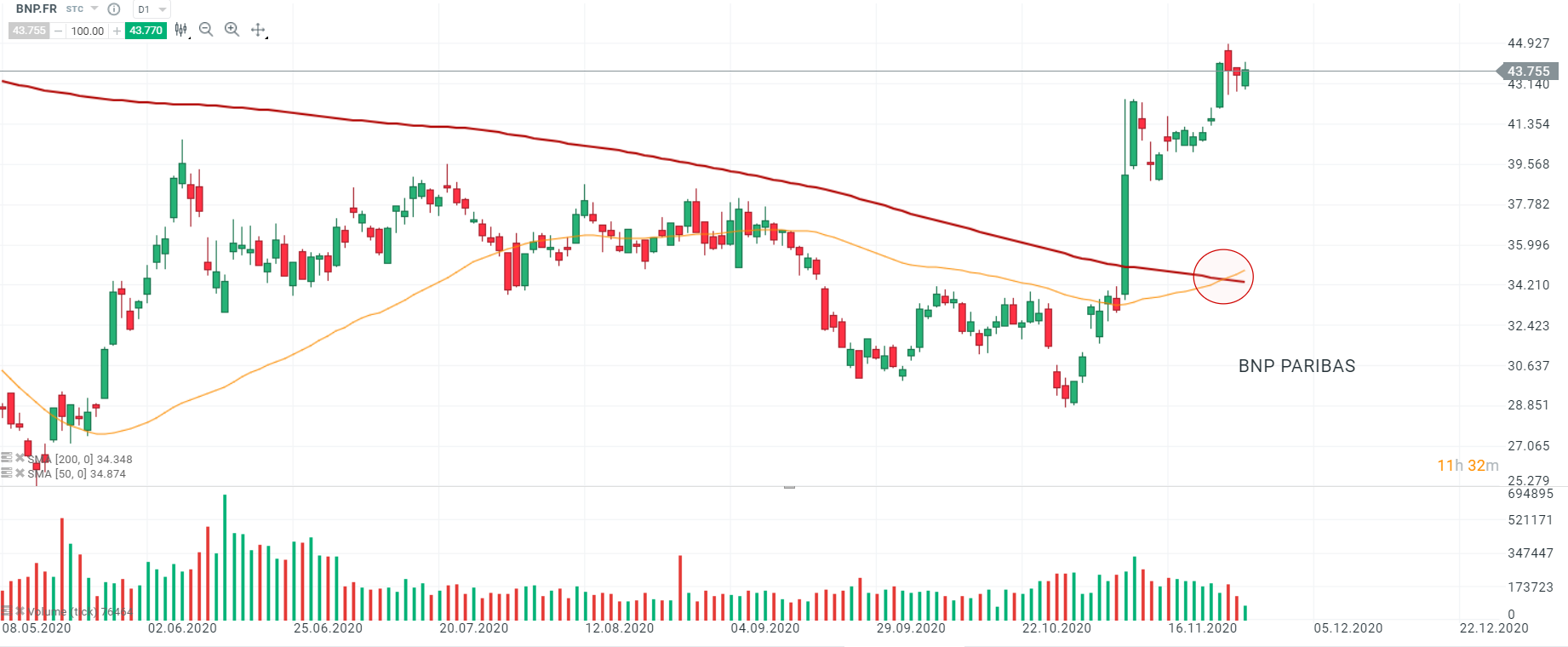 Le titre BNP Paribas (BNP.FR) a débuté la session d’aujourd’hui avec un léger gap baissier rapidement comblé et le mouvement haussier a été confirmé par le croisement à la hausse de la SMA 50 et la SMA 200 (golden cross, cercle rouge). Source : XStation5