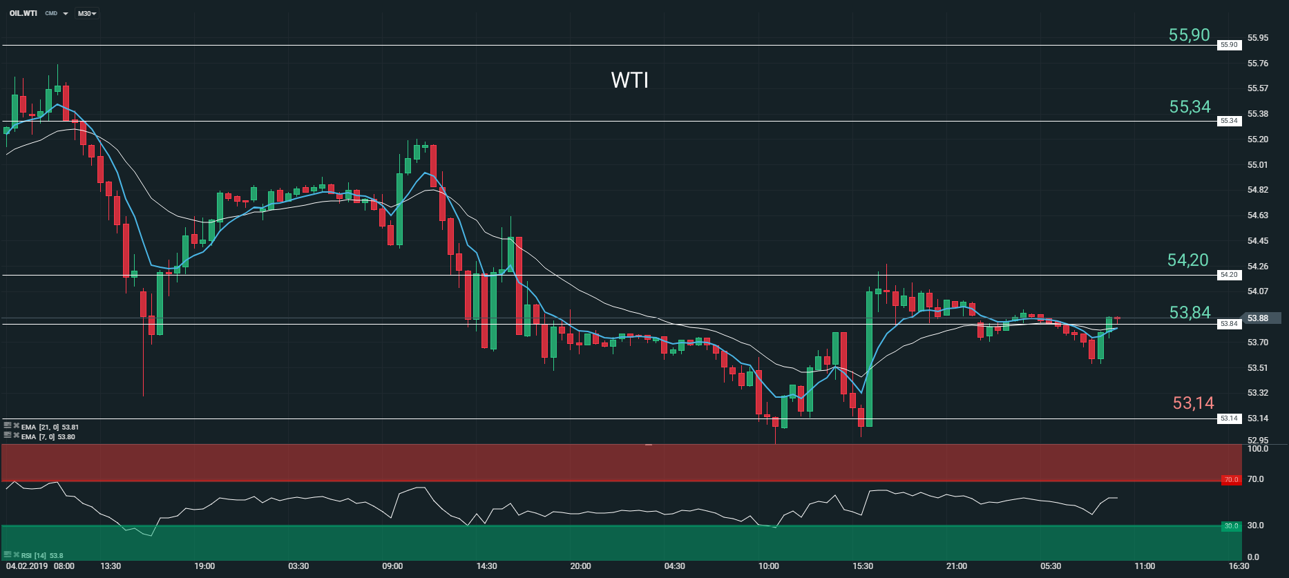 D’après l’Agence d’information sur l’énergie (EIA), les stocks de pétrole brut ont augmenté de 1,26 million à 447,21 millions pour la semaine terminée au 1er février. Dans le même temps, les réserves d’essence ont progressé de 513 000 barils, alors que le consensus anticipait une hausse de 1,6 million. Enfin, les stocks de produits distillés (fioul domestique) ont diminué de 2,26 millions de barils et le taux d’utilisation des capacités des raffineries a augmenté de 0,6 point à 90,7 % sur la même période. L’ensemble des données de l’EIA ont porté les prix du pétrole. Le WTI a terminé mercredi en hausse de 0,65 % à 54,01 dollars le baril. Bien sûr, nous avons un biais très positif sur le contrat WTI et anticipons une poursuite de la progression des cours du pétrole à court/moyen terme.