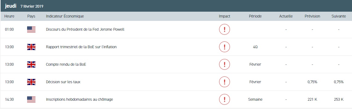 Les marchés sont orientés à la baisse, alors que les opérateurs ont pris connaissance d’une salve de publications de résultats. Aussi, les investisseurs gardent un œil sur le développement des relations commerciales sino-américaines avant une nouvelle rencontre prévue la semaine prochaine entre la Chine et les Etats-Unis à Pékin. Pour aujourd’hui, les opérateurs s’intéresseront à la décision monétaire de la Banque d’Angleterre (BoE) et des inscriptions hebdomadaires au chômage (pour la semaine terminée au 2 février) aux Etats-Unis. Concernant les entreprises, le marché des actions est animé par résultats de Total, Volvo Cars, Sanofi SA et de Société Générale. Enfin, le NIKKEI 225 a clôturé en baisse de 0,59 % à 20 751,28 points en raison de l’affaiblissement des croissances des bénéfices.