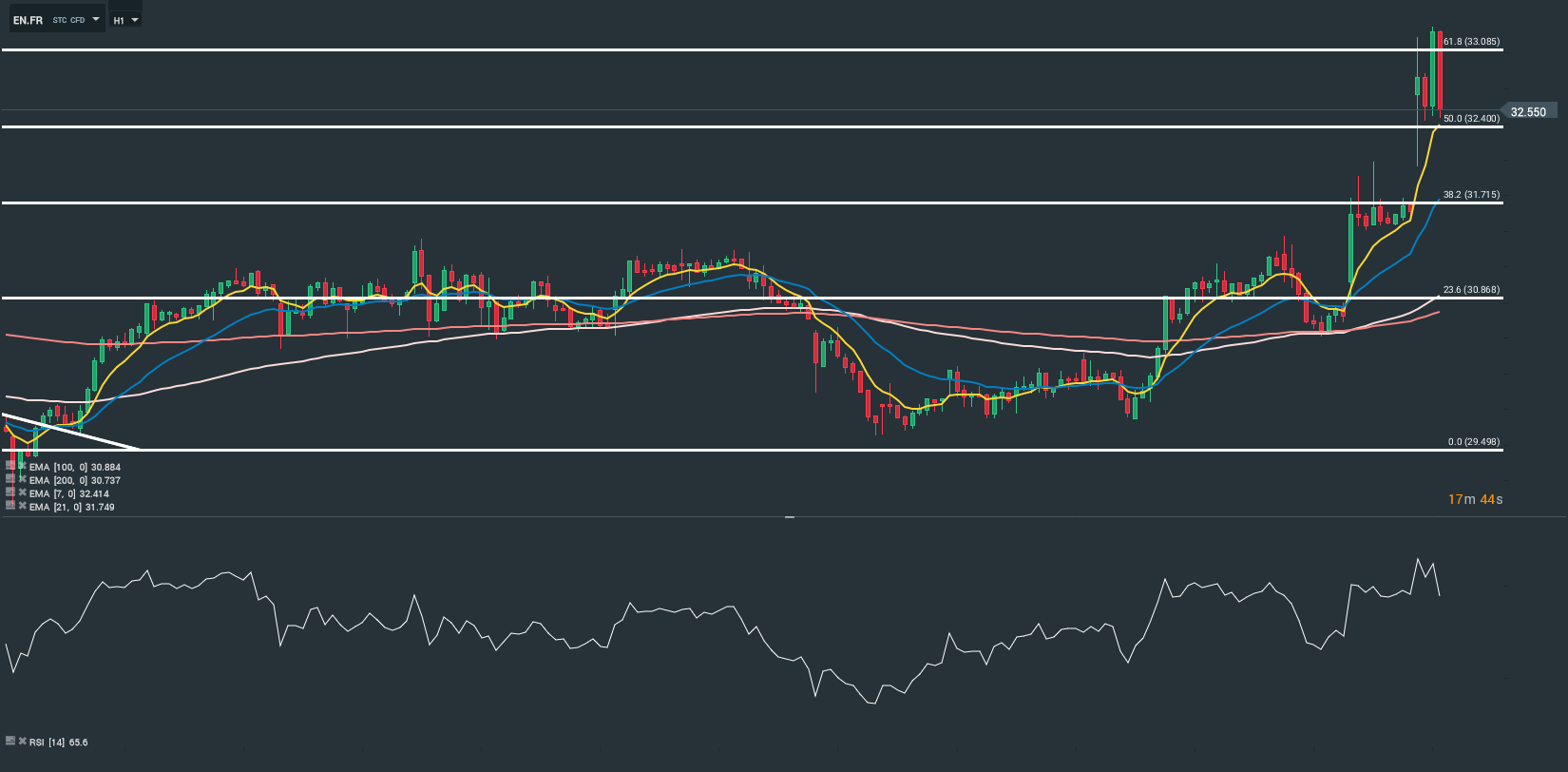 Sur le plan technique, en horizon temporel horaire (H1), les prix sont orientés à la hausse. En effet, vendredi dernier (15 février), les cours ont franchi à la hausse les moyennes mobiles 100 et 200 périodes (à 30,50 euros). Après une légère chute en début de semaine, les prix ont rebondi sur le niveau des 30,50 euros. Depuis, les cours sont soutenus par les moyennes mobiles de long terme (100 et 200 périodes) et de court terme (7 et 21 périodes). Le RSI est orienté à la baisse et oscille au-dessus de sa zone de neutralité (64,7). Pour conclure, nous avons un biais haussier sur l’action Bouygues.