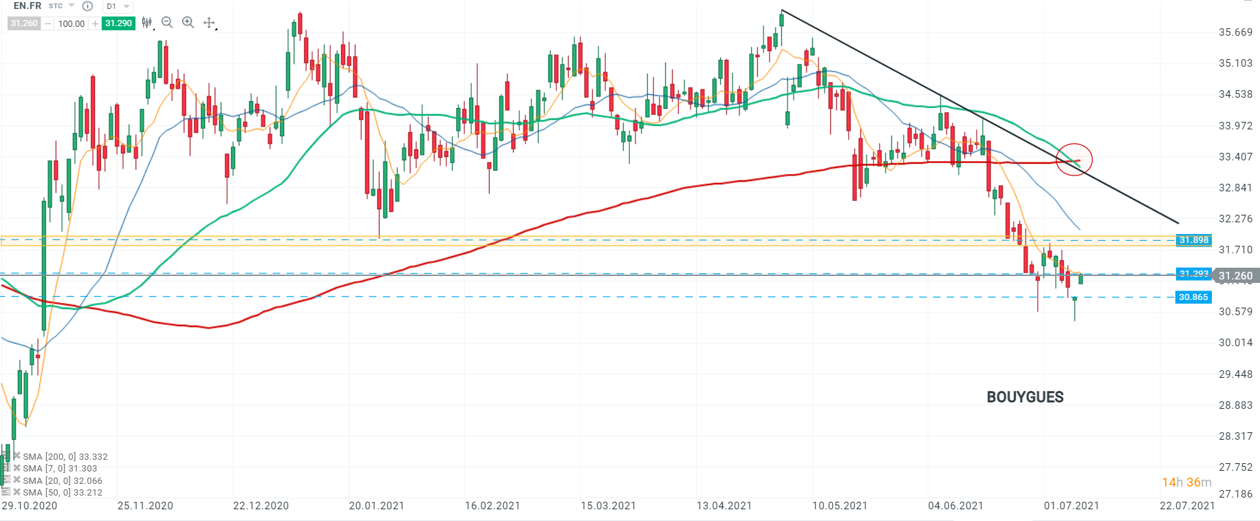 L’annonce de fusion entre les groupes TF1 et M6, ont propulsé les cours de Bouygues (EN.FR) à la hausse, entamant la séance avec un gap haussier. Les cours ont franchi la zone où se situe la SMA 7 (ligne orange) et si le sentiment actuel prévaut, le mouvement haussier pourrait s’étendre vers la zone de résistance comprise entre 31,90 et 32. On remarque toutefois d’un point de vue technique, la formation d’un death cross (croisement à la baisse de la SMA 50 et de la SMA 200) qui est un fort signal baissier. Source : xStation5