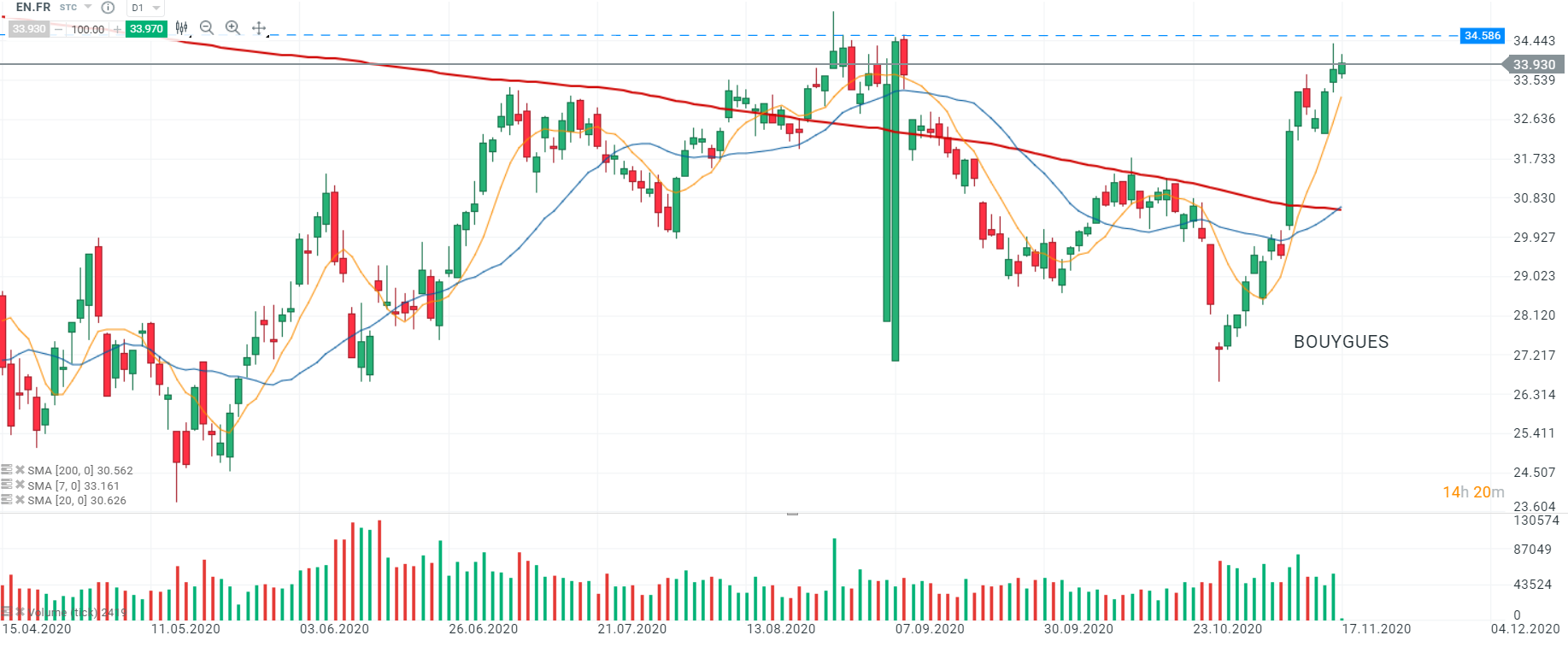 Les cours de Bouygues (EN.FR) se dirigent vers les sommets de la mi-août au niveau de 34,586. La tendance de court-terme reste haussière depuis le passage au-dessus de la zone de résistance comprise entre 32,650 et 33,400 et notamment le passage au-dessus de la SMA200 (ligne rouge). Les perspectives haussières se verront renforcées en cas de franchissement des 34,500.