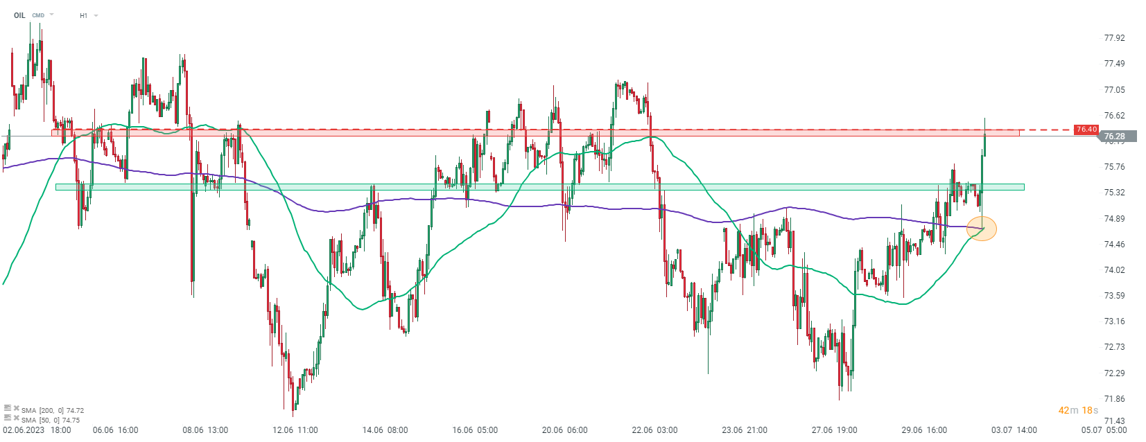 Les prix du pétrole sont en hausse ce matin. Le mouvement était quelque peu déconcertant au départ car il était assez prononcé et il n'y avait pas de nouvelles accompagnantes. Cependant, la raison de cette hausse vient d'être annoncée. Selon des rapports médiatiques, l'Arabie saoudite prolongera sa réduction volontaire de production de 1 million de barils pour un mois supplémentaire (août) ! Peu après, le Premier ministre russe Novak a déclaré que la Russie réduirait l'offre de pétrole en août de 500 000 barils en réduisant les exportations vers les marchés mondiaux de 500 000 barils par jour en août. Tant le Brent (OIL) que le WTI (OIL.WTI) sont en hausse d'environ 1,4 % au moment de la publication.
