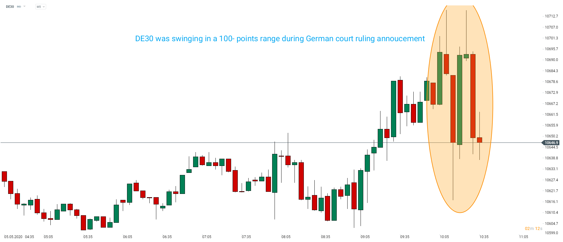 La Cour constitutionnelle allemande a annoncé aujourd'hui une décision dans l'affaire QE de la BCE. Les juges ont rejeté les plaintes par un vote de 7-1. Mais les choses ne sont pas si simples. La Cour a déclaré que certaines parties du programme d'achat d'actifs contrevenaient à la constitution allemande. De plus, il a également été dit que les décisions de la BCE ne sont pas soutenues par des traités de l'UE. Le tribunal a donné à la BCE 3 mois pour régler les problèmes. Si aucune correction n'est apportée, la Bundesbank pourrait ne pas être en mesure de participer aux programmes de relance de la BCE. La Cour a également déclaré que le gouvernement allemand aurait dû s'opposer à l'idée d'acheter des obligations de la BCE. La décision elle-même est assez ambiguë, tout comme la réaction du marché - l'EUR et le DAX ont focalisé tous les intérêts, mais les deux ont finalement baissé.