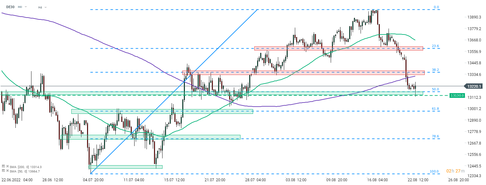 Le DE30 a réussi à effacer la baisse précédente et se négocie maintenant à la hausse ce jour. Les indices PMI ont légèrement fait remonter l'indice, mais l'ampleur des mouvements était plutôt insignifiante. L'indice essaie de rester au-dessus de la zone de support allant au-dessus de la barre des 13 130 pts. Source : xStation5