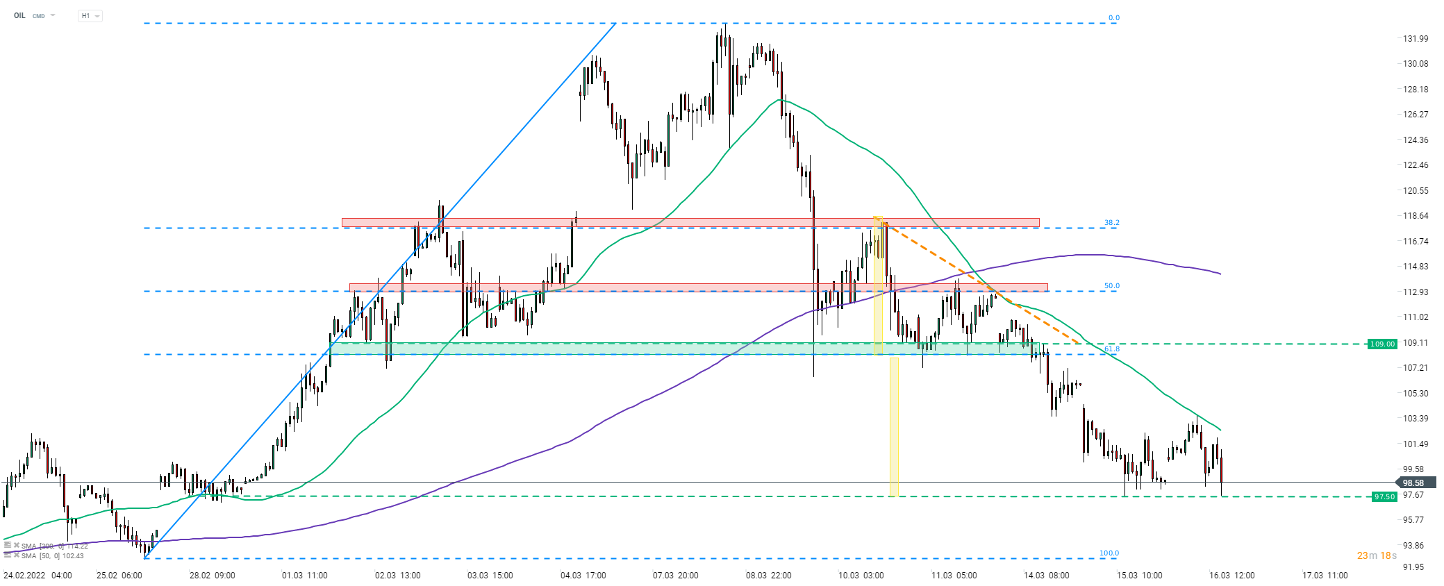 Le Brent (OIL) est passé sous la barre des 98 dollars le baril cet après-midi, la baisse ayant été provoquée par le rapport du Financial Times. L'OIL se négocie à des niveaux proches de ceux du début d'une invasion russe. Notez que les prix ont atteint l'objectif de la cassure baissière du triangle descendant. Source: xStation5