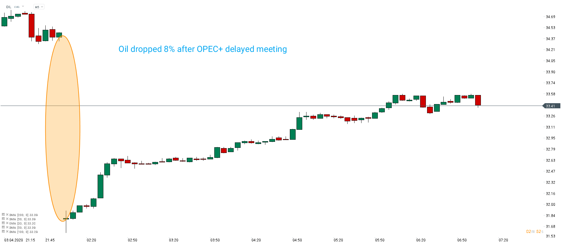 Le cours du pétrole a chuté de manière significative suite au report de la réunion de l'OPEP+. Toutefois, la reprise est en cours. Source : xStation5