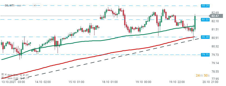 Le prix du pétrole brut WTI (OIL.WTI) a dépassé le niveau de 82,22 $ après la publication du rapport de l'EIA d'aujourd'hui et se dirige vers le prochain niveau de résistance à 83,20 $. Source : xStation5