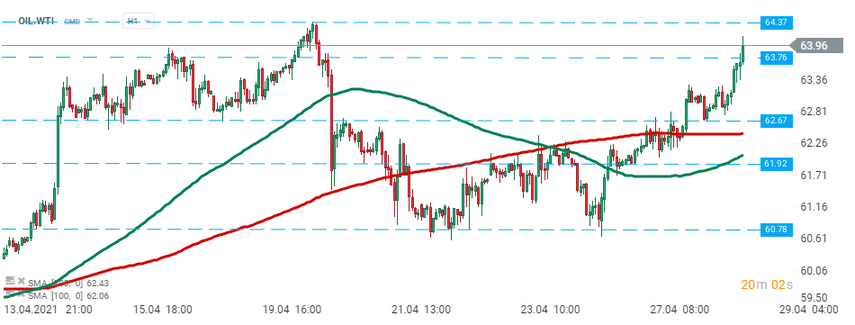 Le cours du pétrole brut WTI (OIL.WTI) a dépassé le niveau de résistance de 63,76 $ après la publication du rapport de l'EIA d'aujourd'hui et se dirige vers la prochaine résistance à 64,37 $. Source : xStation5