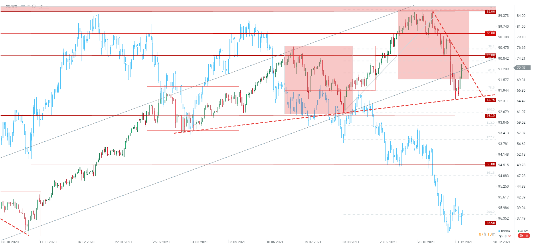 Le pétrole reste élevé aujourd'hui, bien que le rapport d'aujourd'hui ne fasse pas partie des rapports haussiers. Le pétrole est confronté à une importante zone de résistance sous la forme d'une ligne de tendance descendante, puis du retracement à 50% et du niveau de 75. Source : xStation5