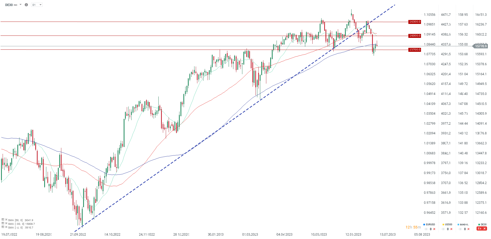 Le sentiment des investisseurs pour juillet en Allemagne, selon l'enquête ZEW, est bien inférieur aux attentes. Des sentiments nettement plus négatifs ont été enregistrés dans les secteurs de l'automobile, de la chimie et de l'acier. La situation dans les services reste bonne. En réponse à ces données, le DE30 (indice DAX allemand) inverse les augmentations précédentes et est déjà coté en dessous de la moyenne mobile à 100 jours.
