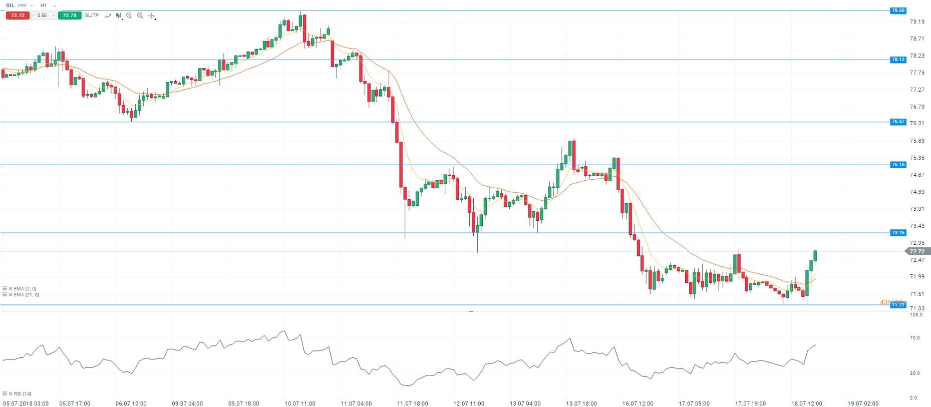 Le département américain de l’Energie (DoE) a fait état d’une hausse inattendue des stocks de brut de 5,8 millions de barils pour la semaine terminée au 13 juillet. Par ailleurs, les stocks d’essence et de produits distillés se sont contractés de respectivement 3,1 millions et 371 000 barils sur cette période. De plus, l’Agence américaine d’information sur l’énergie (EIA) a annoncé que la production domestique a atteint un record avec 11 millions de barils produits. L’essor du pétrole de schiste aux Etats-Unis a permis de franchir ce seuil. Si ce chiffre venait à être confirmé, cela placerait les Etats-Unis au deuxième rang des pays producteurs, après la Russie. Pour rappel, les américains sont les premiers consommateurs au monde. D’un point de vue technique, les prix évoluent au-dessus des moyennes mobiles (à 7 et 21 périodes) en unité de temps horaire (H1). Le RSI est orienté à la hausse vers sa zone de surachat. En conclusion, nous avons un biais acheteur avec comme objectif le niveau des 73,25 dollars le baril.
