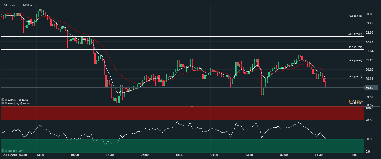 En unité de temps 30 minutes (M30), les cours du Brent (OIL) évolue dans leur zone de range comprise entre 61 $ et 60 $. Les cours sont actuellement capés par les moyennes mobiles à 7 et 21 périodes. Les prix ont traversés leur support situé sur la zone des 60 $ - correspondant au bas de la zone du range mais également aux 23,6 % des retracements de Fibonacci. Le RSI est orienté à la baisse proche de sa zone de « sur vente » et oscille à 29,7 points. Dans ce contexte, nous serons haussiers sur l’actif, avec comme objectif un retour sur le niveau des 61 $ - et par extension le niveau des 61,50 $.