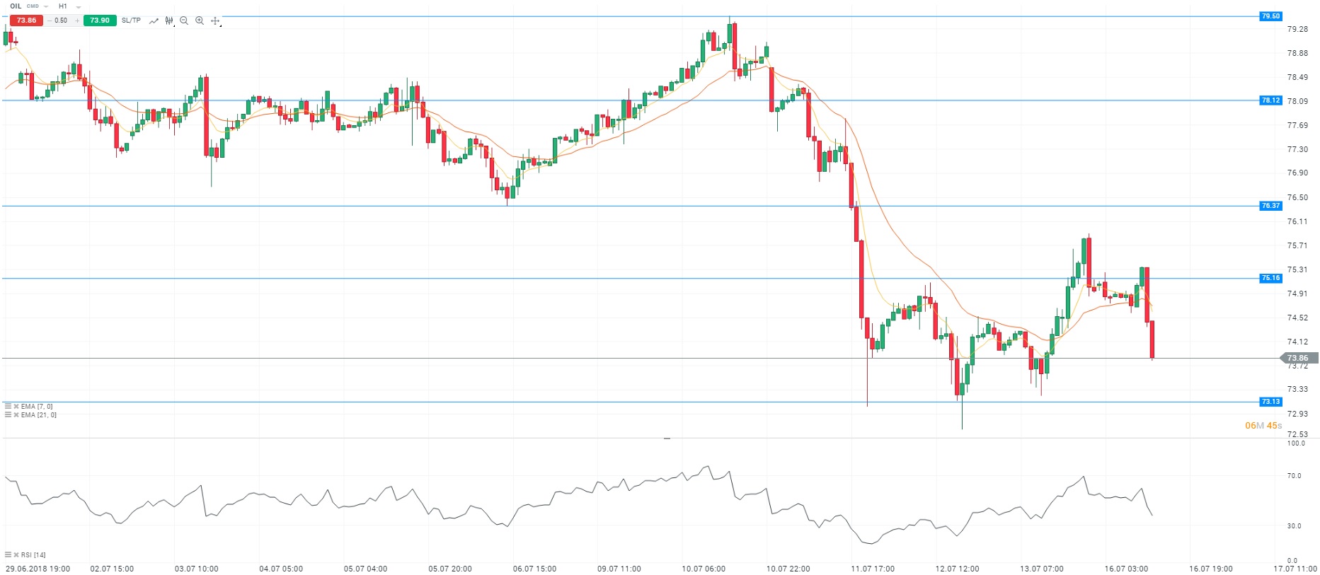 Le ministre iranien du pétrole, Bijan Zanganeh, a écrit à son homologue saoudien, Khalid al-Falih, à propos de l’accord conclu en juin dernier par l’OPEP. Pour rappel, le cartel a décidé d’augmenter sa production à partir du mois de juillet. Cependant, Bijan Zanganeh a déclaré que l’accord conclu ne donnait pas le droit aux pays membres d’augmenter leur production au-delà des objectifs fixés. Par conséquent, le ministre iranien du pétrole a estimé que le non-respect des engagements pourrait nuire à l’efficacité des mesures prises par l’OPEP. Plusieurs sites de production restent perturbés notamment en Norvège et en Irak. Sur un plan technique, les prix oscillent sous les moyennes mobiles (à 7 et 21 périodes) en unité de temps horaire (H1). Le RSI est orienté à la baisse vers sa zone de survente. Pour conclure, nous sommes vendeurs avec comme objectif le niveau des 73,13 dollars le baril.