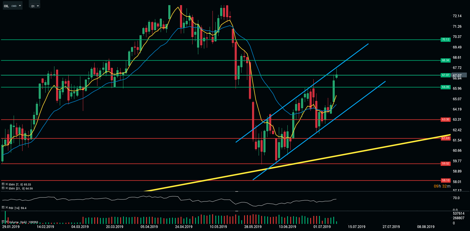 Sur le plan technique, le baril évolue depuis début juin dans un canal ascendant. La montée des tensions entre Washington et Téhéran ont permis au pétrole d’atteindre la borne supérieure du canal. Profitant de cette zone de résistance majeure et de la déclaration de l’OPEP, les vendeurs sont parvenus à ramener les prix au niveau des 67 $ le baril. Pour l’heure, la bataille entre haussiers et baissiers fait rage.