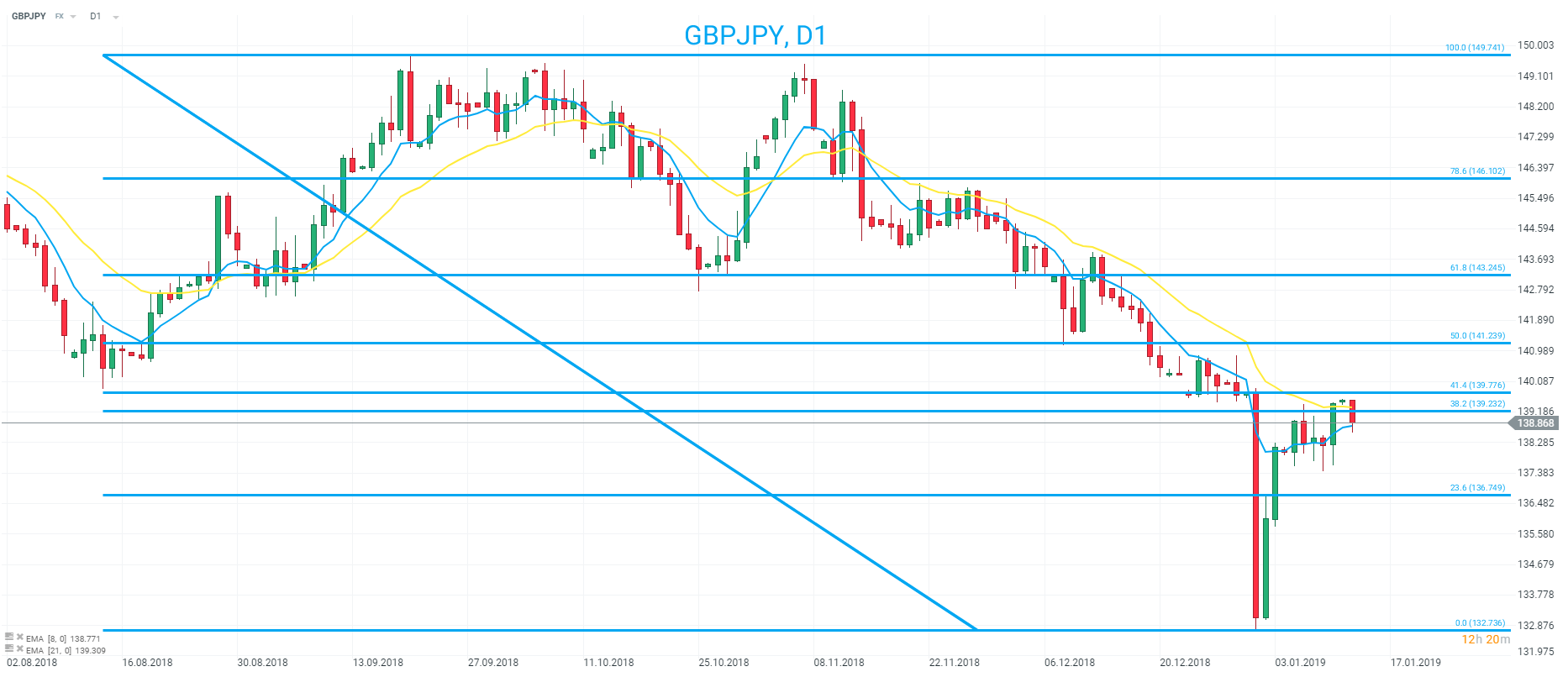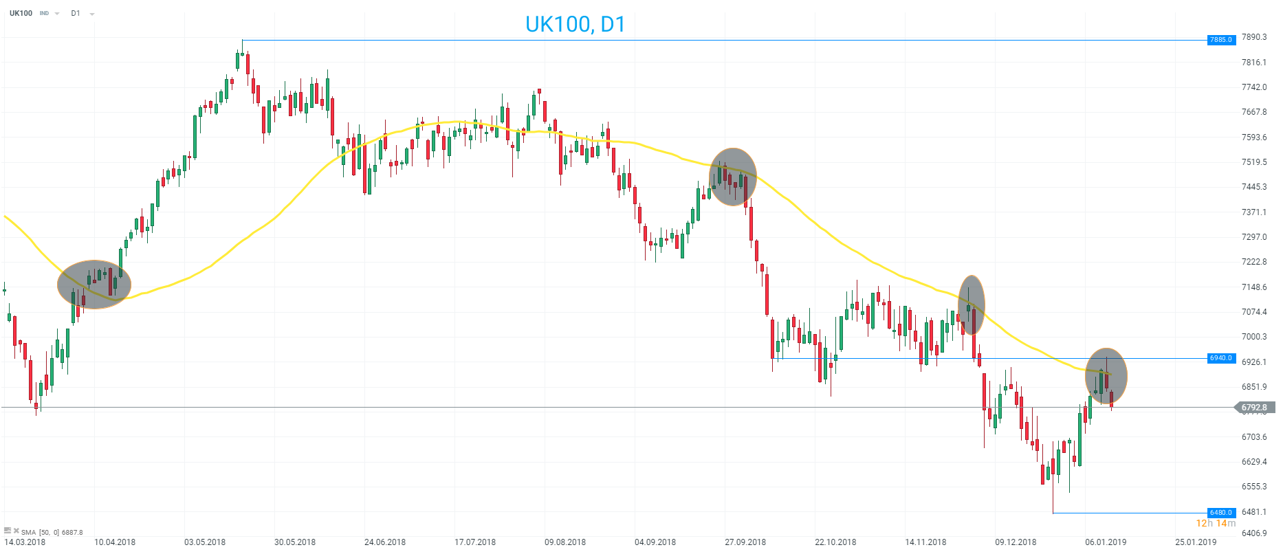 Les actions britanniques ont connu un début d’année plutôt satisfaisant sur l’indice londonien (FTSE 100 - UK100) qui a atteint son plus haut niveau en 5 semaines à 6 940 points. Ce niveau coïncide avec le support précédent où le marché s’est effondré depuis début décembre, niveau qui correspond également avec la moyenne mobile à 50 périodes - un indicateur qui a très bien identifié la tendance de l’année écoulée. Il s’agit d’un niveau important, avec des vendeurs qui se situent en -dessous. En revanche, une cassure (à la hausse) des 6 940 points pourrait inverser la tendance et permettre à certains haussiers de se reconstruire après les lourdes pertes enregistrées sur la dernière partie de l’année 2018.