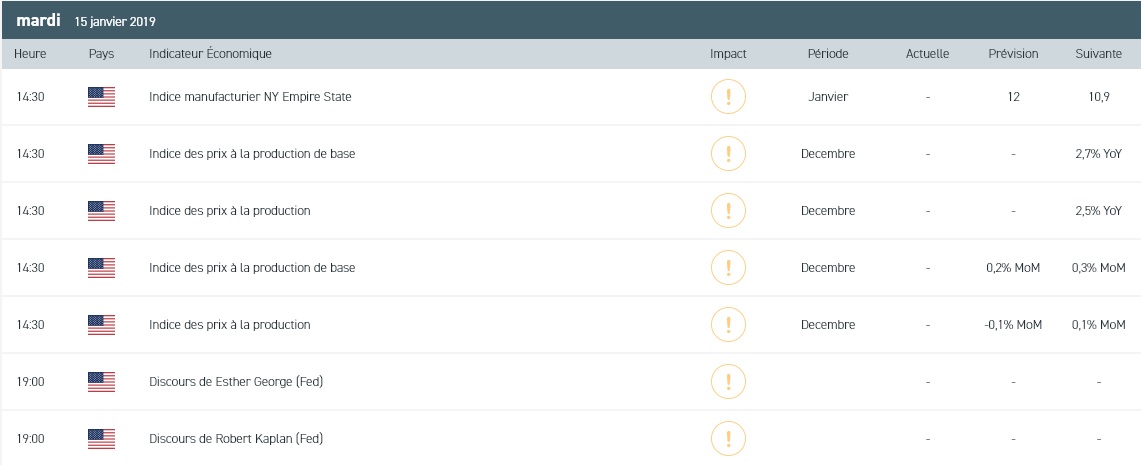 Les marchés semblent rassurés par le volontarisme du gouvernement chinois à l’égard de son économie locale. Toutefois, l’inquiétude domine car le Parlement britannique doit voter ce jour l’accord de sortie du Royaume-Uni de l’Union européenne (UE). Les résultats du vote seront connus ce jour à 21h. Concernant le calendrier économique de ce mardi, nous prendrons connaissance de la balance commerciale du mois de novembre en zone euro et du discours de Mario Draghi, président de la Banque centrale européenne (BCE). Du côté des Etats-Unis, nous nous intéresserons à l’indice d’activité manufacturière Empire State dans la région de New York, à l’évolution des prix à la production et aux premières estimations de stocks de pétrole brut pour la semaine terminée au 11 janvier. Sur le front des entreprises, nous assisterons à la publication des résultats des banques Wells Fargo et JP Morgan. Décryptage.