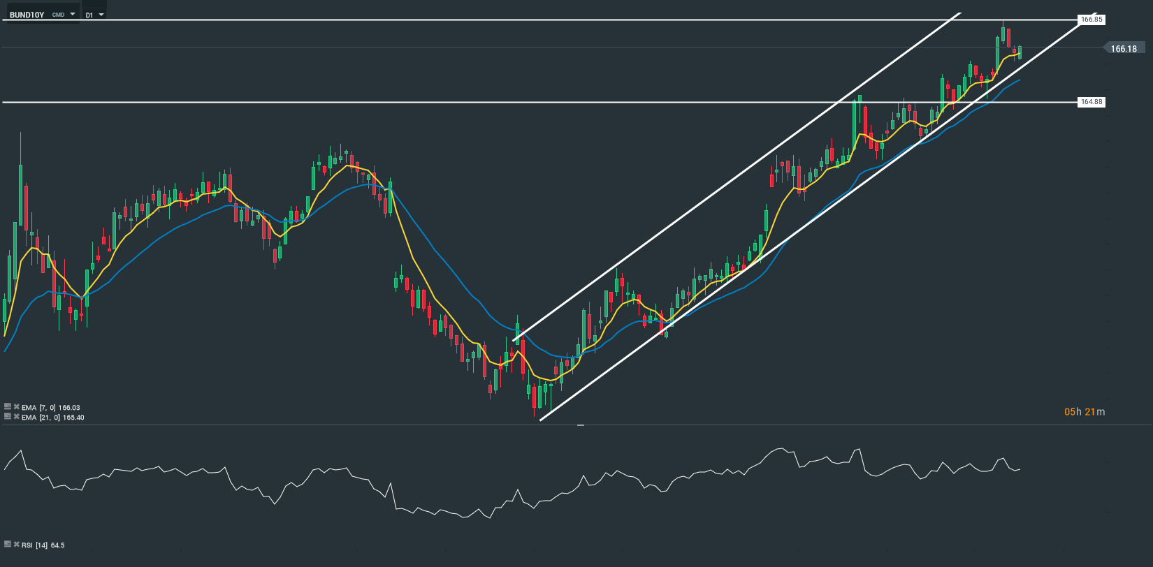 Sur le volet technique, en horizon temporel journalier (D1), le Bund évolue dans un canal haussier. Les prix sont soutenus par les moyennes mobiles 7 et 21 périodes. Le RSI oscille en dehors de sa zone de neutralité (64,5). A court terme il est probable que le niveau des 166 soit atteint. En cas de sorti (vers le bas) du canal les prix pourraient rallier le niveau des 164.