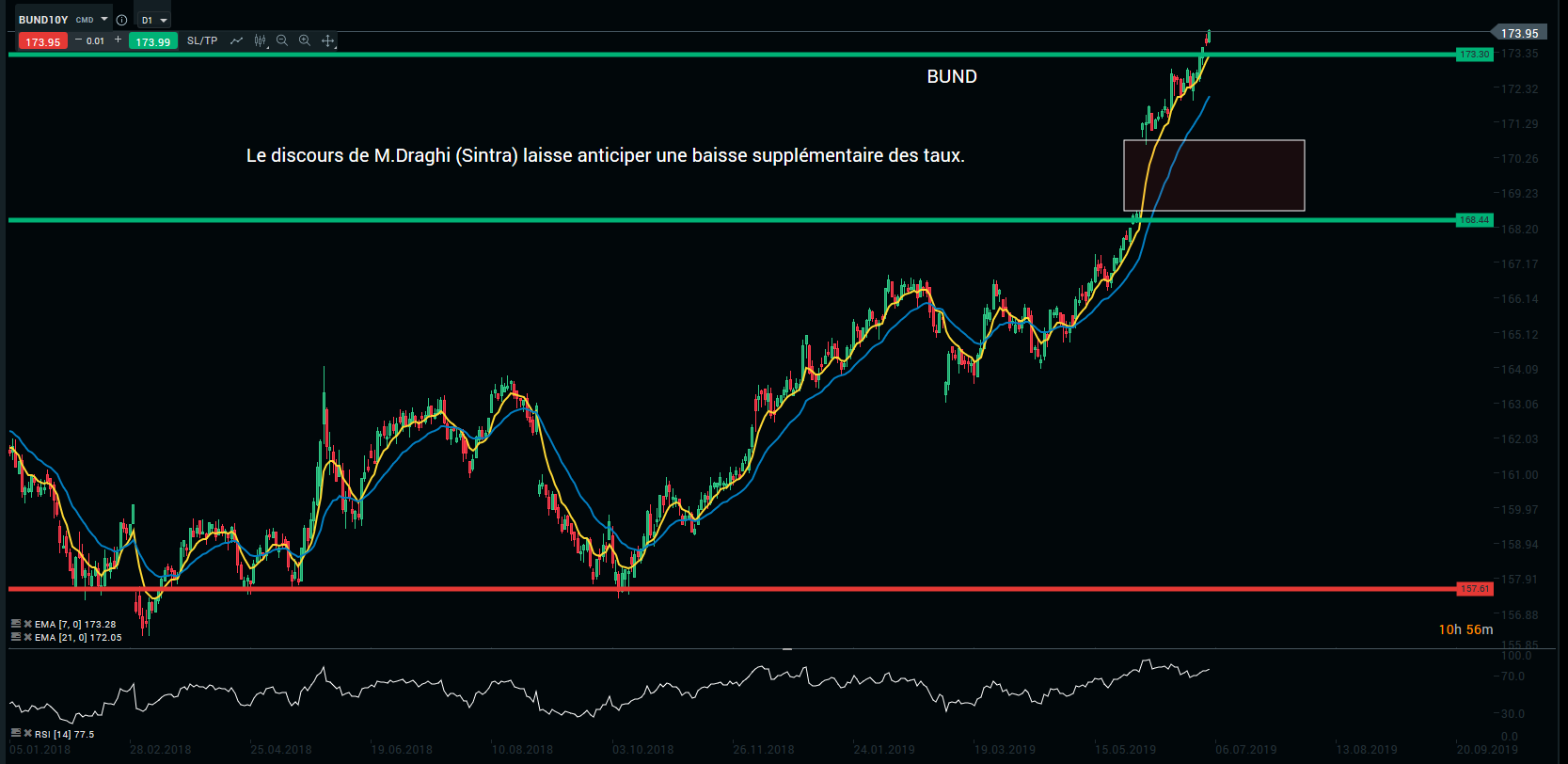 Le rendement du Bund allemand est tombé à -0,405% alors que le taux de la facilité de dépôt de la Banque centrale européenne (BCE) est fixé à -0,4% (taux auquel les dépôts des banques commerciales sont rémunérés à la BCE). Lors de la crise financière de 2008, les rendements à 10 ans de la première économie de la zone euro s'étaient rapprochés des taux directeurs de la BCE, sans toutefois passer en dessous. En effet, en décembre 2008, alors que le taux de dépôt était fixé à 2,75%, le rendement du Bund à 10 ans était tombé à 3,04%. Nul doute que la politique monétaire non conventionnelle de M.Draghi a eu des effets majeurs sur les prix de la monnaie.