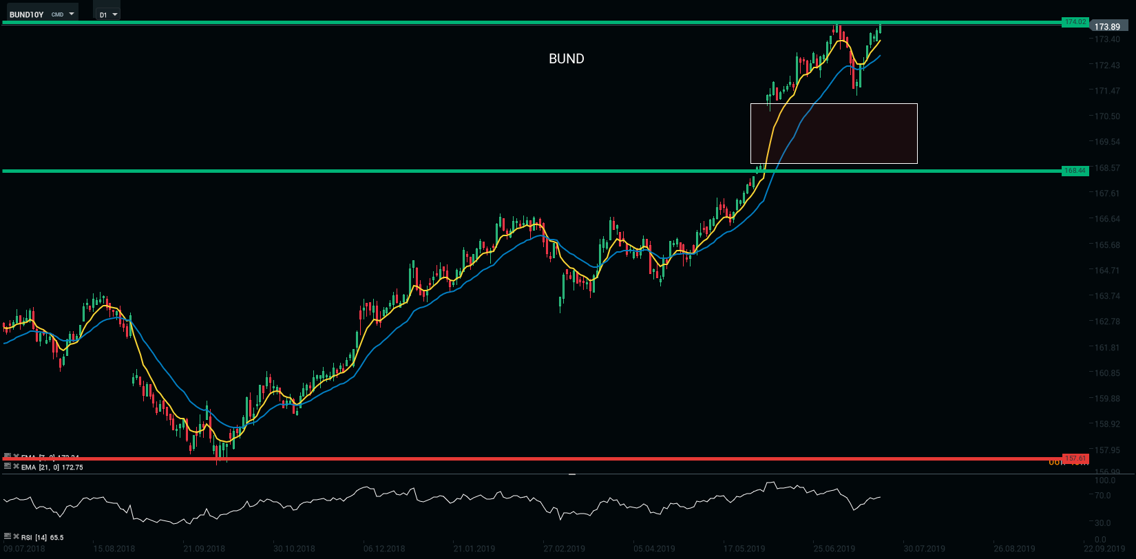 Le Bund fait partie des instruments qui performent le mieux depuis le début de l’année. La baisse des perspectives de croissance en Allemagne, les pressions déflationnistes, ainsi que les tensions géopolitiques mondiales ont entraîné le Bund10Y à la hausse. Après une légère correction survenue au mois de juillet, les prix ont rebondi sur les 171,05. Pour l’heure, les acheteurs sont parvenus à retrouver les 173,94. La séance de jeudi est très attendue par les investisseurs.