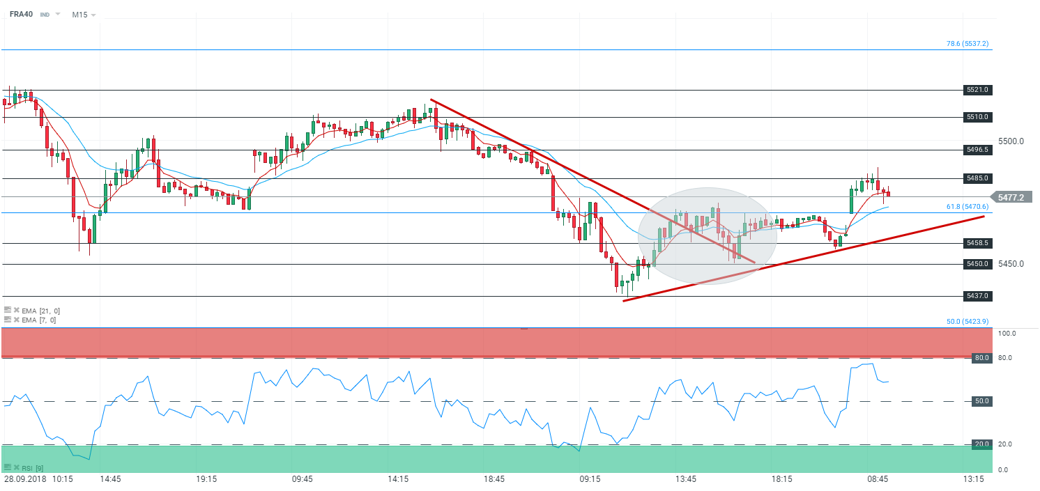 En 15 minutes (M15), l’indice français a ouvert en gap haussier porté par les espoirs d’une accalmie sur le dossier italien. Les cours évoluent au-dessus du niveau des 5 470 points – correspondant aux 61,8 % des retracements de Fibonnaci. De plus les prix sont portés par les moyennes mobiles à 7 et 21 périodes. A noter que les cours se sont affranchis par le haut de la résistance oblique formée en ce début de semaine. Le RSI est bien orienté et s’aplatit proche de sa zone de neutralité à 63,1 points. Dans ce contexte nous serons haussiers sur l’indice. Cependant nous attendrons un retour sur le niveau des 5 470 points afin d’entrer à l’achat avec en ligne de mire le niveau des 5 485 points à court terme – puis le niveau des 5 495 points.