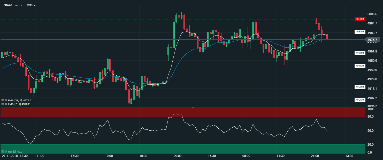 En unité de temps 30 minutes (M30), l’indice français (FRA40), évolue toujours au sein de sa zone de range comprise entre 5 000 points et 4 945 points. Les cours sont capés par la moyenne mobile à 7 périodes, et viennent à présent chercher la moyenne mobile à 21 périodes. Le RSI tend à s’aplatir proche sur sa zone de neutralité et oscille à 49,6 points. Dans ce contexte, nous serons baissiers sur l’indice français, avec comme objectif le niveau des 4 960 points.