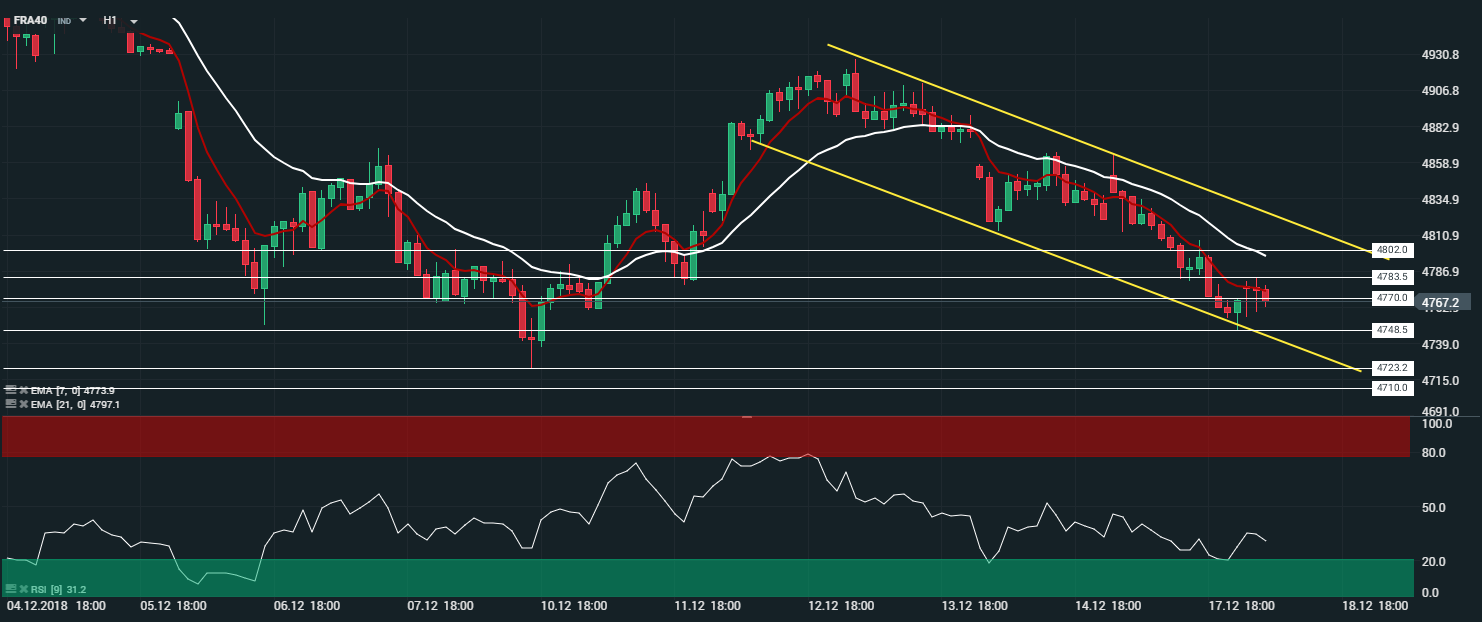 En unité de temps horaire (H1), l’indice CAC 40 (FRA40) évolue en tendance baissière au sein de son canal baissier. Les cours sont capés par les moyennes mobiles à 7 et 21 périodes. Le RSI est orienté à la baisse et oscille à 29,9 points. Dans ce contexte, nous serons baissiers sur l’indice, avec comme objectif le niveau des 4 784,5 points.